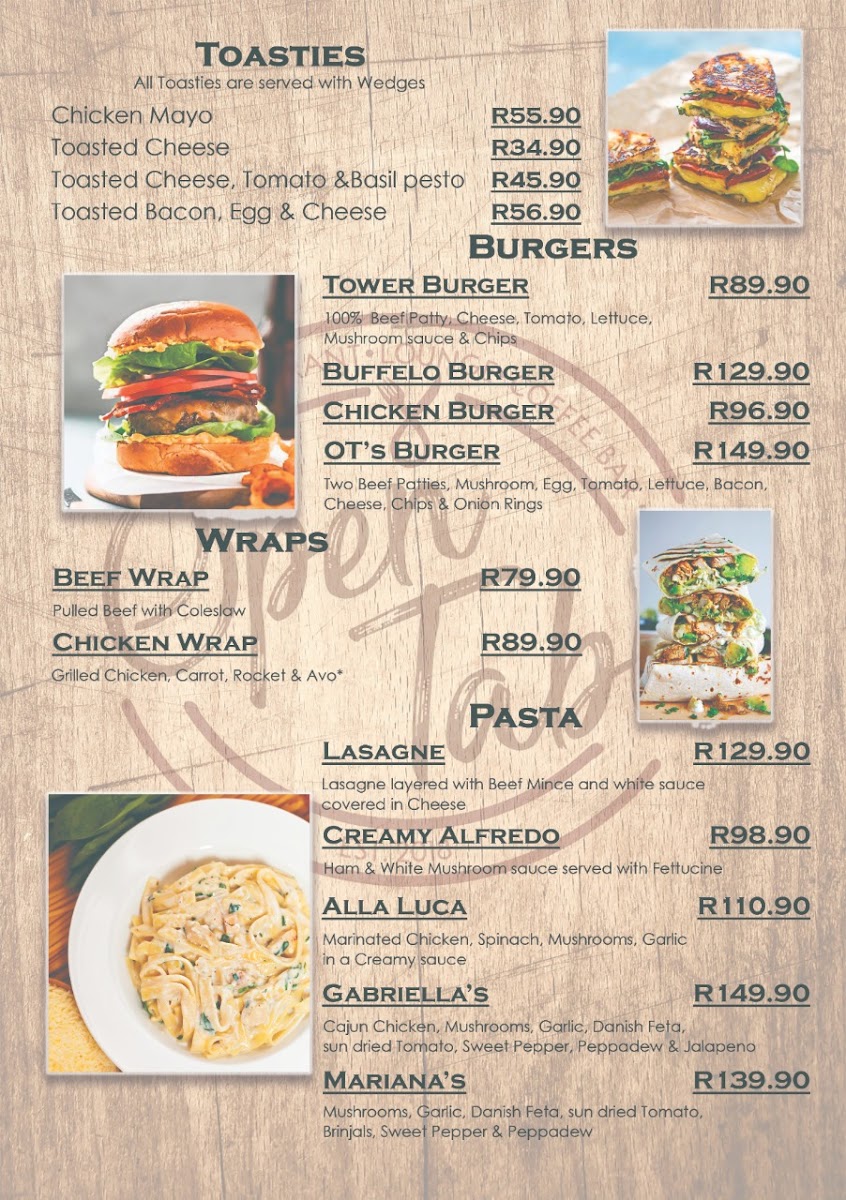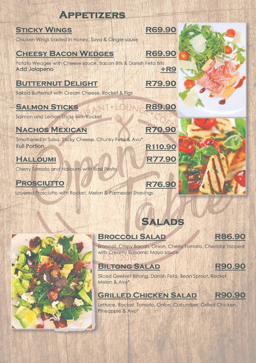 Welcome to Open Table, a charming cafe located in the heart of Vanderbijlpark. Here, every dish tells a story of flavor and comfort. Their menu features an enticing range of appetizers like Sticky Chicken Wings and Cheesy Bacon & Jalapeno Wedges, perfect for starting your culinary journey. For salad lovers, the OT Salad, rich with ingredients such as Avo and Brie, offers a refreshing twist.